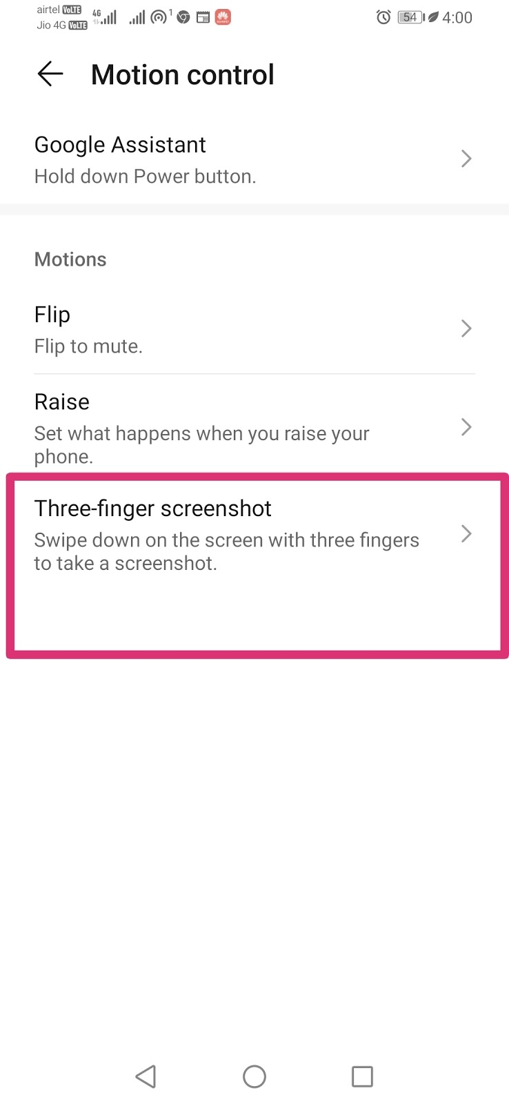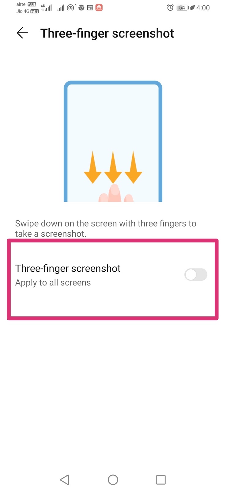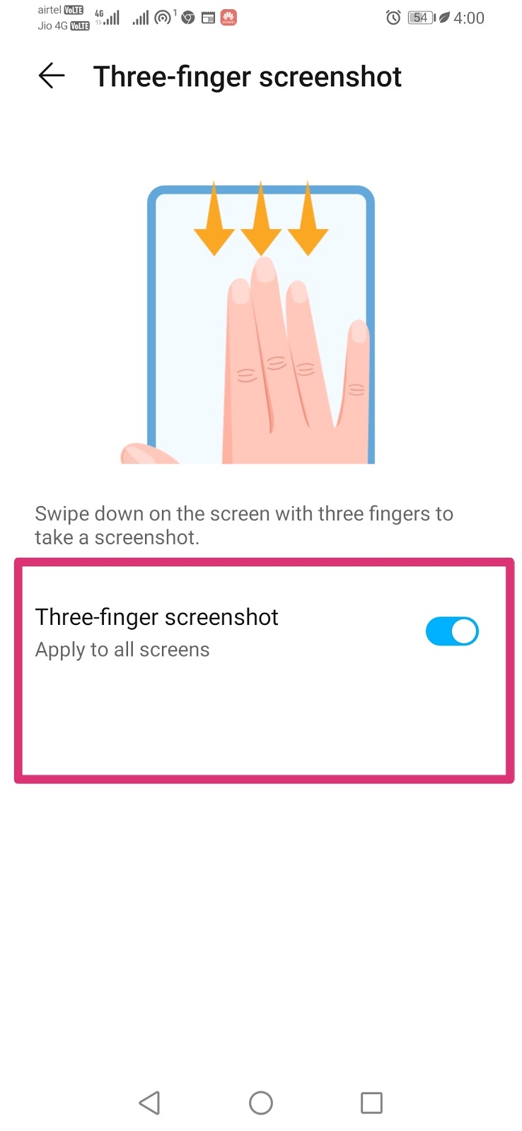 यहाँ पर आप three finger screen shot को चालू कर दें