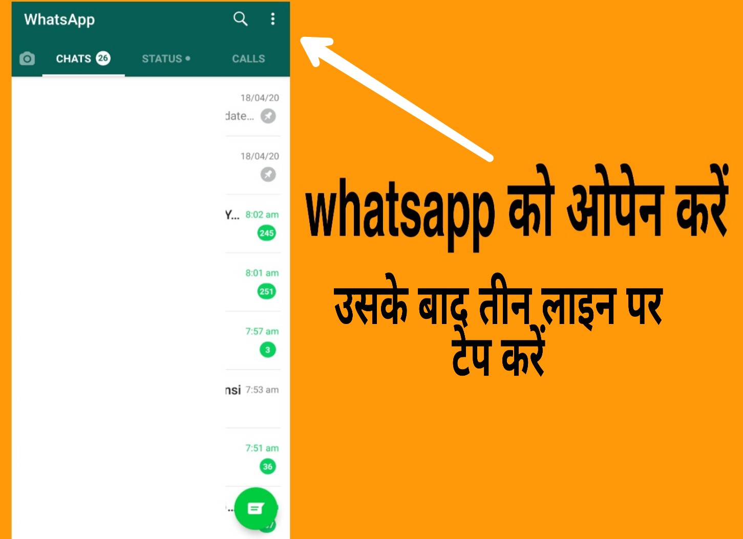 Whatsapp को ओपेन करने के बाद आपको राइट साइड में ऊपर तीन लाइन पर टेप करें और उसको ओपेन कर लें