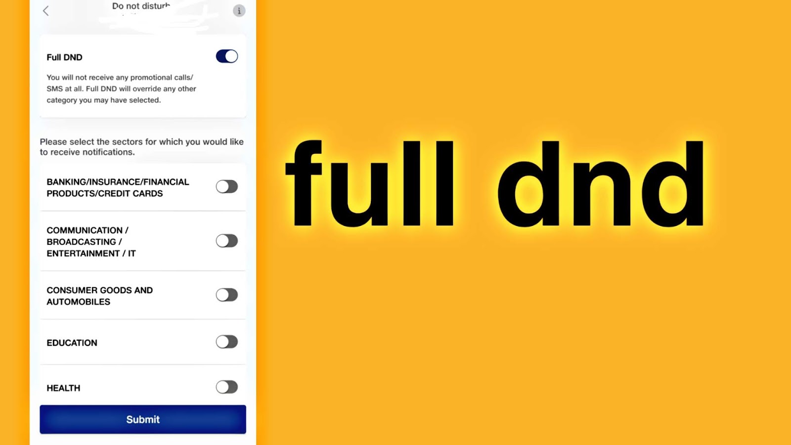 उसमें आपको full dnd का ऑप्शन मिलेगा यहां पर आप जो भी केटेगिरी को dnd करना चाहते हैं उसको सेलेक्ट करके dnd कर सकते हैं और अगर आप सभी को बंद करना चाहते हैं तो फुल dnd कर सकते हैं ये करने के बाद आपको एक मैसेज मिलेगा की आपकी full dnd सर्विस एक्टिव हो गई है