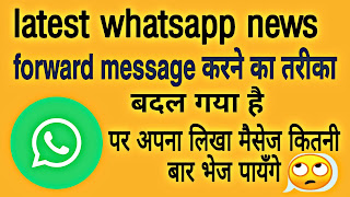 दोस्तों आप सभी व्हाट्सएप का इस्तेमाल तो करते ही है और व्हाट्सएप इतना लोकप्रिय मैसेंजर aap है इसलिए व्हाट्सएप की तरफ से इसमें कई सारे फीचर्स ऐड कर दिए जाते हैं इस समय व्हाट्सएप में एक नया फीचर आया है अब आप व्हाट्सएप में फॉरवर्ड मैसेज एक से ज्यादा लोंगो को नहीं भेज पायँगे क्योंकि जो फॉरवेर्डेड मैसेज होता है जिसे  डबल एरो आइकॉन होता हैं उस मैसेज को किसी दूसरे के जरिये भेजा जाता हैं और आप उसकी फारवर्ड कर देते हैं पर अब नही कर पायँगे अब एक बार मैं एक को ही भेज सकते हैं पहले आप पांच लोगों को एक साथ भेज सकते थे
