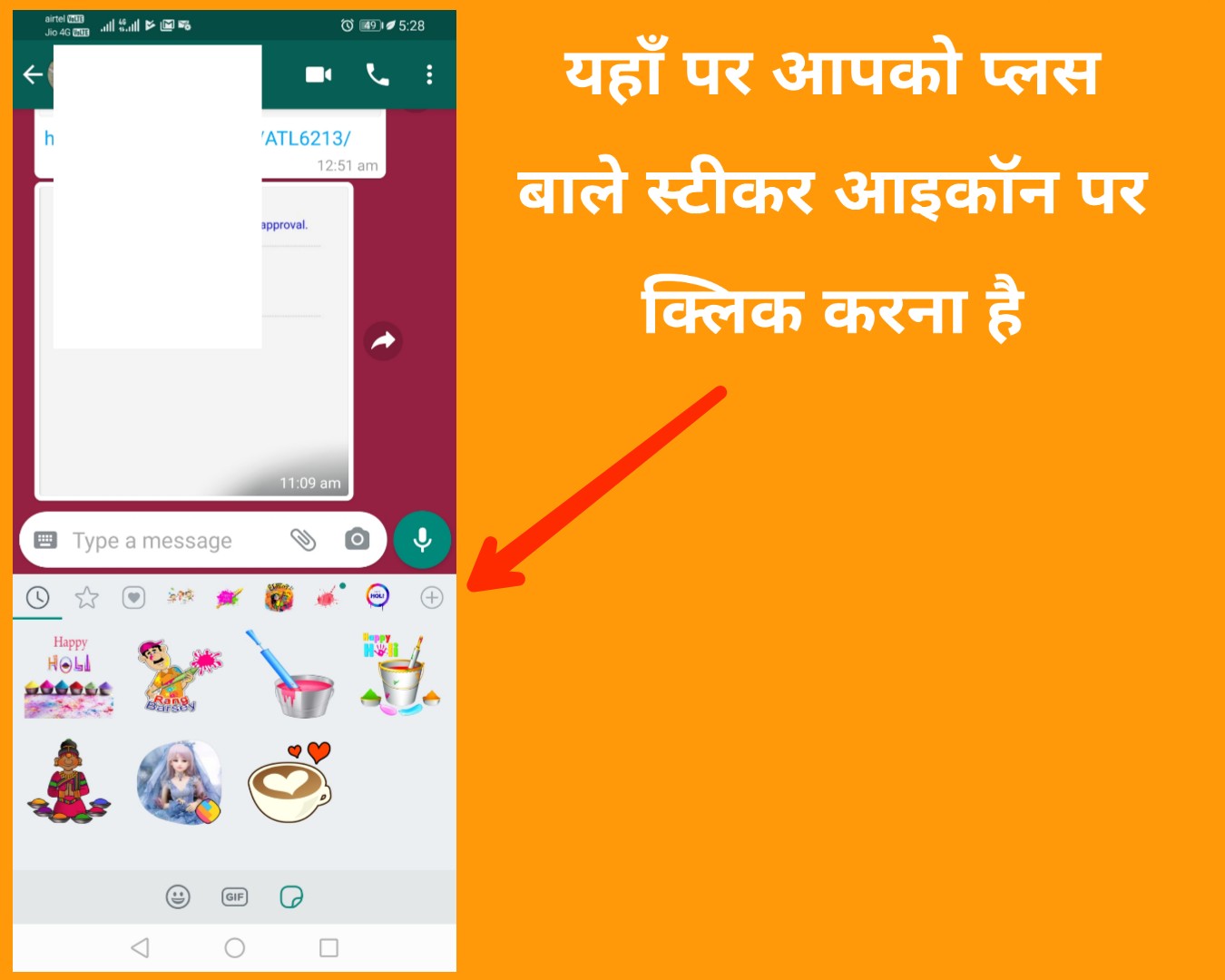 इसके बाद स्टीकर का ऑप्शन आएगा यहाँ पर प्लस बाले निशान पर क्लिक करें