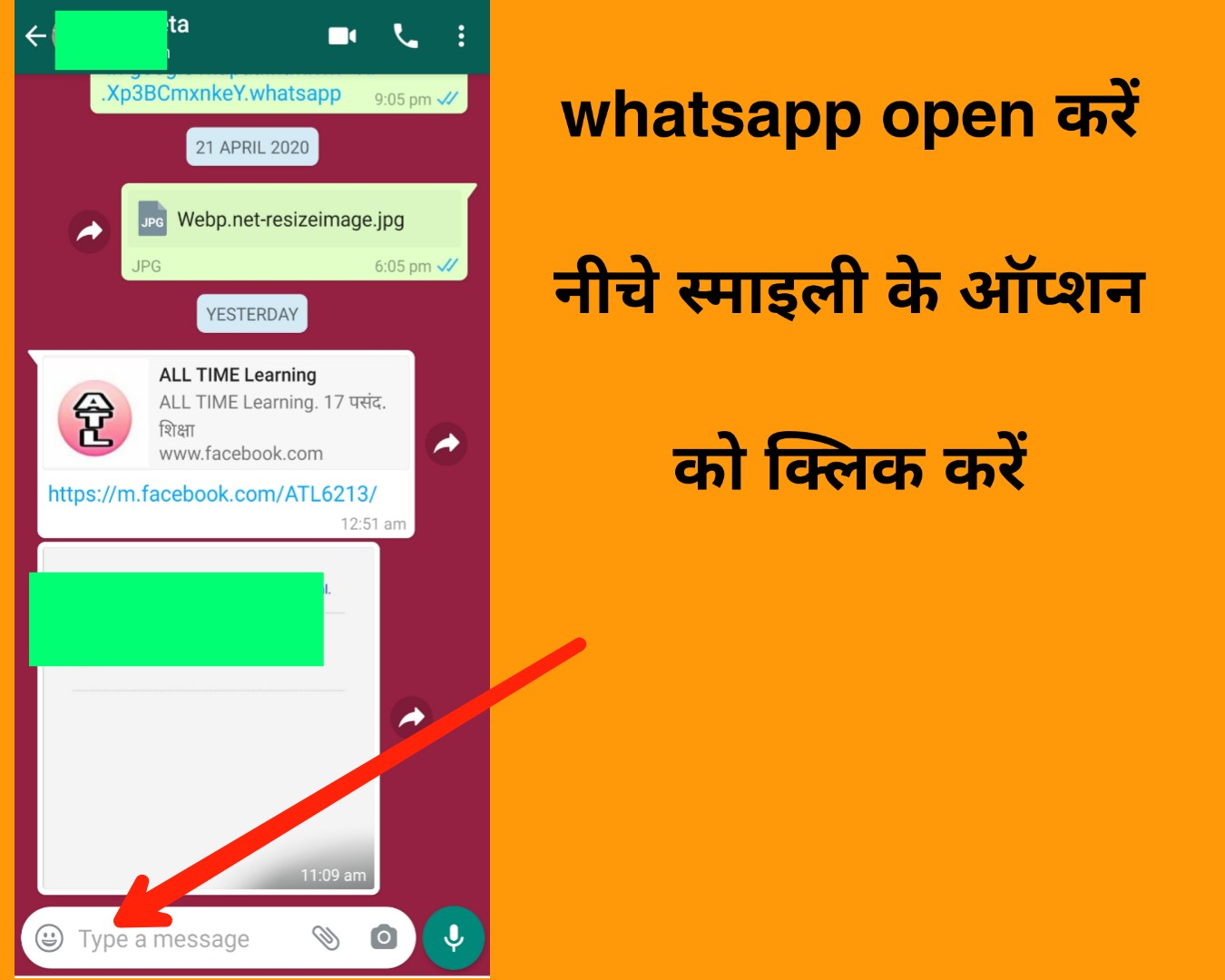 तो सबसे पहले व्हाट्सएप को ओपन कर लें और जिसको चैट करना है उस पर टैप करें नीचे लेफ्ट कॉर्नर पर स्माइली आइकॉन पर क्लिक करें